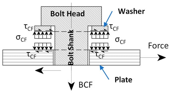 Friction-type connections have proven efficient in enhancing the behavior of metallic bolted joints [44]. Several experimental and numerical works studied the effect of bolt-tightening torque on the stiffness and strength of the CBJs [11,26,45,46,47,48,49,50,51]. Figure 7 shows the load transfer mechanism of the pure friction type connection. The value of the normal stress (σCF) and shear stress (τCF) between the washer and the bolt head control the behavior of the friction-type connection. It is very difficult in FRP composite bolted joints to achieve the amount of BCF required to behave as a pure friction joint due to the low stiffness and strength in the thickness direction. In CBJs, it was found that a hybrid bearing friction mechanism takes place [26].