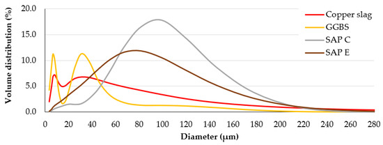 Particle size distribution of precursors GGBS, CS, and SAPs by laser diffraction.