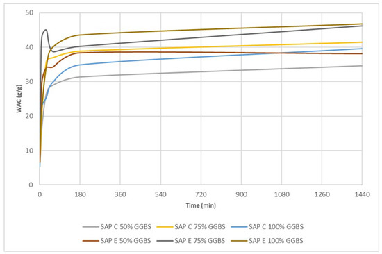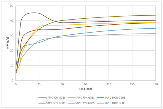 The lowest WAC in the first 30 min was attained for 100GC solution, followed by 50GC. This can be attributed to a high number of calcium ions within GGBS, which inhibit SAP absorption capacity [43]. This tendency is more pronounced with SAP C. The highest WAC occurs initially in 75GE solution. In the later stages (after approx. 45 min), the highest WAC was achieved in 100GE solutions.