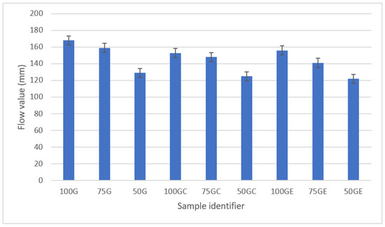Workability of mortars was measured by flow table tests, and the results are shown in Figure 4.
