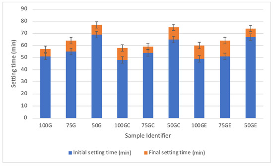 Figure 5 shows initial and final setting times results by Vicat test. The addition of CS within the mix significantly increases the setting times.