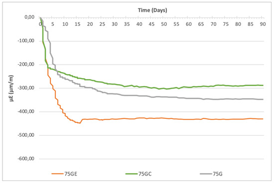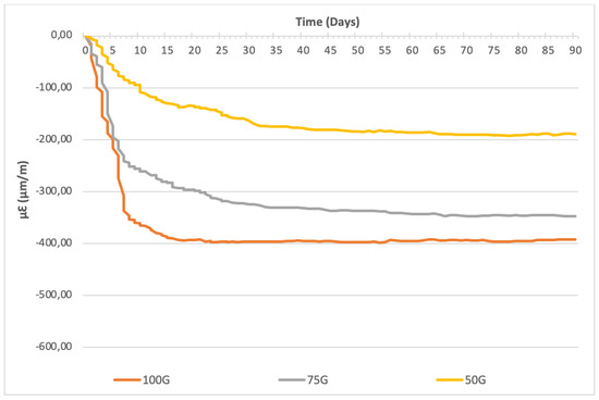 Figure 6 shows autogenous shrinkage (AS) results of reference mortars (without SAP). A progressive increase in copper slag in composites results in reduction in AS. This is due to the higher reactivity of GGBS over CS, where more reactions occur in the reactive GGBS precursor. The 100G and 75G samples experience very rapid autogenous shrinkage, whereas the 50G sample has a low shrinkage and slower onset.
