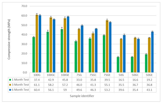This outcome is in line with compressive strength results shown in Figure 10. All samples were tested at 1, 3, and 6 months.