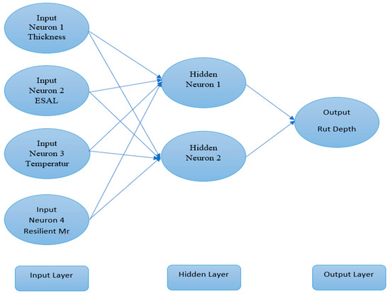One recent advancement in deep learning is ANN. A computational model called ANN imitates how neurons work in the human brain. Simply said, ANN uses learning algorithms that can be modified by themselves as they gather new data. Therefore, they provide a great modeling tool for non-linear statistical data. ANN models typically consist of three layers linked by weighted linkages. The input layer is the top layer, directly connected to the hidden layer, while the output layer is the third layer [20,21]. A prediction model for Rutting Depth is developed using 4 input variables and 70 observations (Figure 3). The main aim was to develop an ANN-based prediction model with fewer hidden neurons possible to obtain the best results and to extract an equation. A multilinear ANN was used to predict, with four hidden neurons to obtain a simplified equation with a good R2 value.