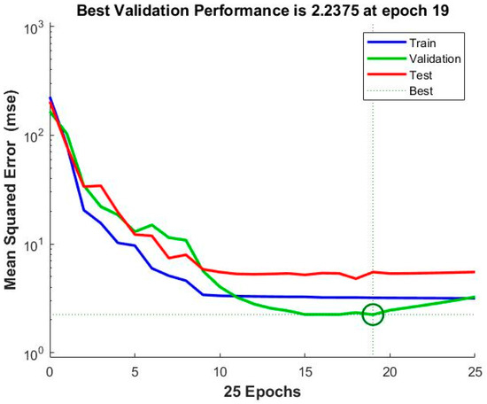 Every input was normalized between [−1, 1] to reduce the influence of variables with a huge numerical value. The normalized output is then finally denormalized to obtain the actual output value. The ANN algorithm allocates weights and biases at random in the first iteration. Then, the model’s output is compared to the training observations measured data. The error is the difference between the ANN model output and the measured output. The goal of the training was to reduce the Mean Square Error (MSE) as much as possible by altering the weights and biases with each iteration. Backpropagation was used to modify the weights and biases. An epoch is a unit of time that includes both forward and backward propagation. With each epoch, the model’s MSE is improved. Figure 5 shows that the best performance of the model was at the 19th iteration with 2.2375 MSE.