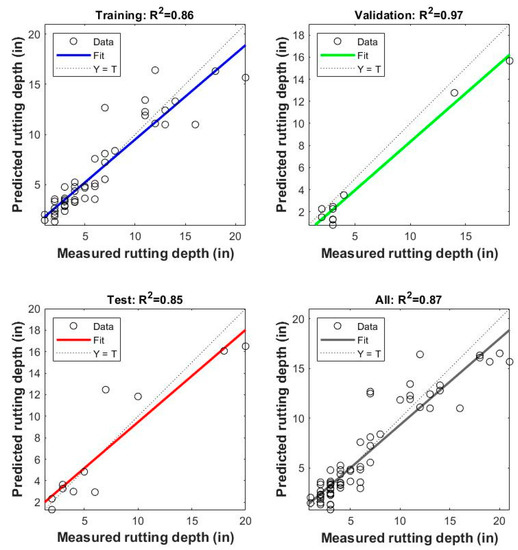 Using an IC section, the foundation type, lane type, surface type, and accumulated number of vehicles were used as inputs to develop a prediction model of rutting depth; the authors in [15] stated that this study was limited to the Hokuriku expressway. The authors in [16] studied the effects of temperature and traffic using the ABAQUS finite element program, and found that the significant effects of both thermal and traffic loading conditions on the rutting damage of flexible pavement, and higher temperatures will provide a high rut depth more than traffic loading for the asphalt layer, base layer, and subgrade layer. Local empirical models were used by the authors in [17] to calculate permanent deformation such as environmental and traffic conditions using ANSYS software. They considered Equivalent Single Axle Load (ESAL) and wheel spacing with tire contact pressure and assumed homogeneous and isotropic materials with a specified resilient modulus and Poisson’s ratio. A previous study predicted the rut depth by ANN using viscoelastic parameters by trying to provide a model that can estimate the rutting depth; the model provided good accuracy with a high R-value [18]. The neural network model for rutting depth agreed well with the experimental data. Given the high R values, it is possible to conclude that the neural network model can predict rut depth with an acceptable level of accuracy [19].