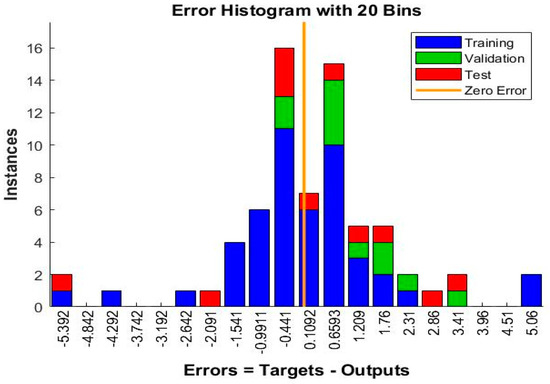 The histogram of errors between target values and predicted values after training a feedforward neural network is known as the error histogram. These error numbers can be negative because they represent how anticipated values depart from target values. The number of vertical bars shown below in Figure 7 is considered bins. The number of samples from the dataset that fall into each category is represented on the Y-axis.