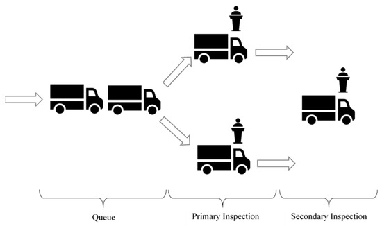 Once it is the turn of the commercial truck to go through the inspection booth, officers at the POE verify each vehicle’s documentation and cargo. A vehicle that fails to pass the primary inspection is subjected to secondary inspection. Figure 1 presents the layout of the checkpoint with one queue, two inspection lanes, and one secondary inspection lane.