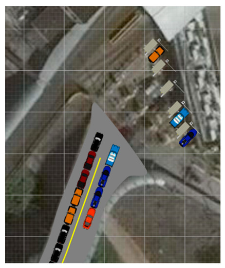 For this research, the Gateway International Border (GIB) POE in Brownsville, TX, was used as a case study. The first step was to develop a discrete event simulation model of the POE using SIMIO [23]. The POE consists of two lanes, which lead to five checkpoints (i.e., servers). Each checkpoint may be open or closed at hourly intervals. The overall footprint of the model within SIMIO was drawn to scale by importing a map of the border crossing using a geographic information system (GIS) [24]. Figure 2 presents the placement of the five checkpoints, some online with vehicles being served and others offline (i.e., no officer at the booth). The two lanes on the bottom portion of the figure are vehicles from Mexico waiting to be served before entering the U.S.