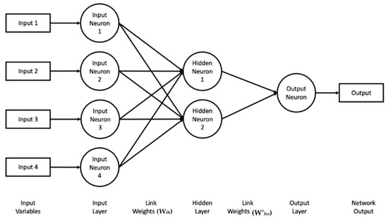 The second model was an ANN. A three-layer, feed-forward backpropagation ANN with a sigmoid activation function and one hidden layer is the most common type of neural network [22]. In addition, one hidden layer is typically sufficient for solving most of the non-linear problems without network overfitting [22]. For the purpose of this study, a three-layer, feed-forward neural network, with a hyperbolic tangent activation function, a backpropagation-error calculation algorithm, and two neurons in the hidden layer, was utilized using MATLAB [32]. Figure 3 demonstrates the utilized network architecture for the study, and its main components may be summarized as follows: