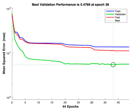 Before feeding into the network, each input variable was normalized to fall within the range [−1, 1]. Additionally, the output neuron predicts the normalized output, which also falls within the range of [−1, 1]. The output from the output neuron is then denormalized, so that the predicted PM2.5 value falls within an acceptable range (see Table 2 for minimum and maximum values). The training was conducted utilizing the Levenberg–Marquardt backpropagation algorithm in MATLAB [32]. This training algorithm divides the data into three categories. A total of 70% of the data were randomly utilized for training the model, while the remaining 30% of the data were divided into model testing and validation data sets. The ANN model was developed using only the training data. The testing and validation data were unseen to the developed ANN model. As shown in Figure 4, as an effort to avoid overfitting and maintain network generalization, the training was stopped when the validation dataset root mean square error stopped decreasing [22,32].
