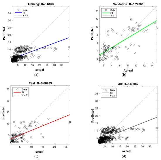 The model performance was evaluated in MATLAB, as shown in Figure 5, which demonstrates the ability of the model in the prediction of . The ANN model yielded a relatively low coefficient of determination (R2) of 0.402 for the entire dataset (i.e., training, testing, and validation data). This means that the data possesses a high variability around the regression line, as presented in Figure 5.