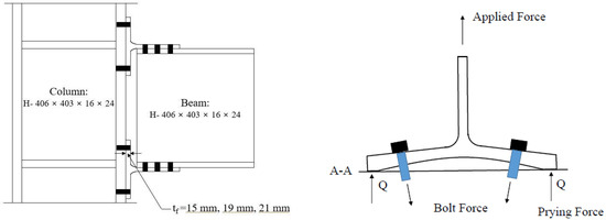 As shown in Figure 1, it is possible to develop a prying action between the T-stub flange and the support base. By preloading the T-stub bolts, a contact stress is created between the T-stub flange and the support base. Atasoy [13] and Kulak et al. [14] note that when external loads are applied to the T-stub web, a contact pressure might be generated between the flange edge and the base. Figure 1 also shows how such contact stress would overload the T-stub bolts with a prying action force, Q, based on the flexural rigidity of the T-stub base flange. As a result of this force, the T-stub connector bolts are at risk of premature failure [15].