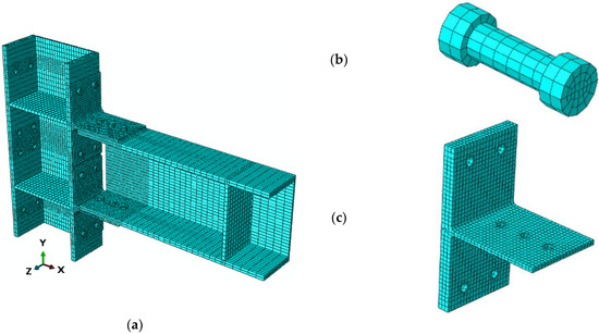 Details of T-stub connection mesh: (a) overview, (b) bolt, and (c) T-stub.