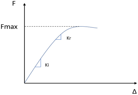 The response curve variables are provided by using the force–displacement curve as shown in Figure 6. Table 5 presents the response variable factors. The initial stiffness (Ki) of a bolted steel connection at a drift of 0.3% is defined as the secant stiffness and is calculated from the cyclic response. The residual stiffness or post-yield stiffness (Kr) of a bolted steel connection after the decompression has occurred is also shown, as well as the maximum force (Fmax) in the connection under lateral loading.