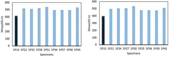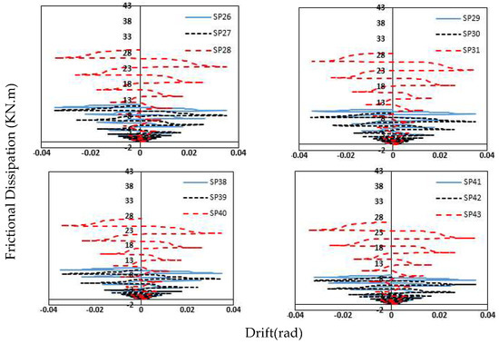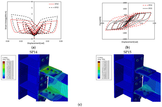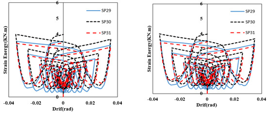 Figure 7 depicts the structural behavior curves and Von Mises distributions for models SP14 and SP15. Consequently, in the SP15 model, a reduction in the strength could be noticeably seen compared with the SP14 model. Based on the Von-Mises distribution at a 4% drift, the SP14 model shows a significant focus on stress in comparison to the SP15 model. However, in the SP15 model, there is a sharp increase in the strain energy value that occurs when the drift exceeds 2%.