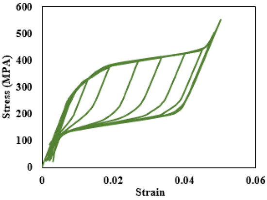 Shape memory alloy (SMA) has been used in seismic applications because it can withstand large loads and recover its original shape by unloading and heating. Utilizing SMA is related to self-centering and energy dissipation capacities in behavior (Wang et al. [103] and Wang and Zhu [104]). According to Pereiro-Barceló et al. [105], the reversible transitions between martensite and austenite identify this distinct property. The SMA likely recovers up to 8% strain in the mode of NiTi alloy because the austenite phase exhibits superplastic behavior (Chowdhury et al. [106]). NiTi material is imported into the ABAQUS based on the mechanical characteristics described in DesRoches et al. [102].