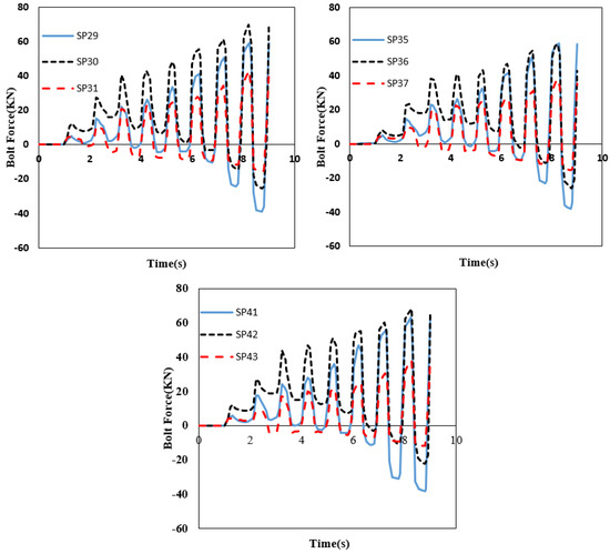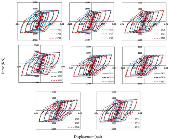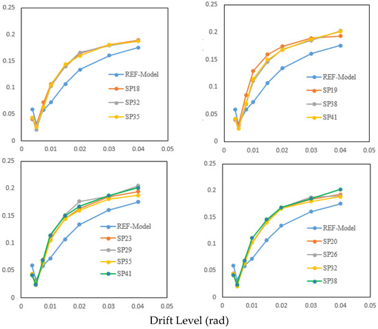 The SP01 to SP03 models showed a decrease in L2 value of ~50%. The SP04 to SP07 models were classified based on changing the number and material of bolts. For example, in the SP04 model, the bolts that connected the T-stub section to beam flanges were reduced from six to two in number. Based on the SP08 to SP13 models, a change in the T-stub’s yield stress and thickness or the bolt pretension load could be seen. The steel and SMA were equipped with either a bolt column or a T-stub, as shown in the SP14 and SP15 models. In the SP16 to SP19 models, the T-stub section was equipped with a triangular stiffener as the thickness and number differed.