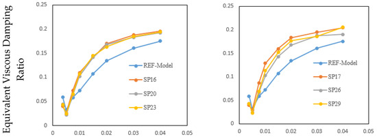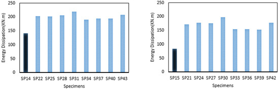 The ductility capacity and residual displacement of the SP14 model were more than 20 and 40%, respectively, compared with the SP15 model. This conclusion was derived from Figure 7b. These changes illustrated more effectiveness of the SMA column bolts than the SMA T-stub in enhancing the ductility and residual displacement of the bolted steel connection.