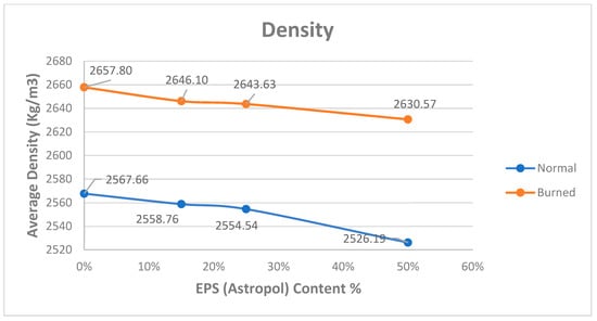 - The density of all the different mix specimens in both normal and burned conditions gradually decreased as the ratio of EPS increased.