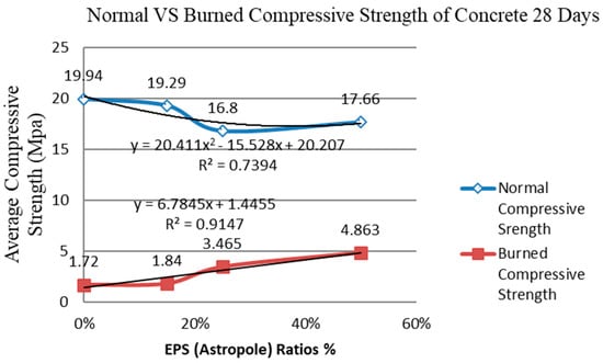 - There was a gradual decrease in compressive strength before burning the specimens at different ratios when compared to the control specimens. However, after burning the specimens, a gradual increasing trend was seen in the compressive strength values, which is why it can be said that adding EPS (Astropol) increases the post-fire mechanical property of concrete.