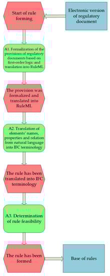 The rule-forming algorithm for verification of the building information models based on the RuleML consists of two main stages, as shown in Figure 2. The description of the algorithm is performed in accordance with the EPC notation. An electronic copy of the regulatory document is received at the input of the algorithm, and a set of rules is formed at the output, which is placed in the database.