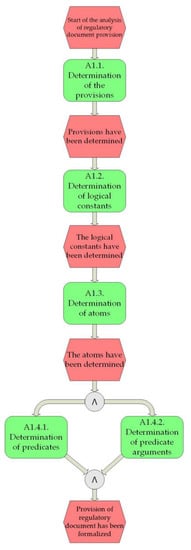 Single statements, logical constants, atoms, predicates, and arguments of this statement are consistently identified within a provision (stages A1.1–A1.4, Figure 3). Normally, a provision may contain several statements, i.e., establish several interrelated requirements. Usually (but not always) one sentence of a paragraph corresponds to one statement. Statements are divided into requirements and informative statements.
