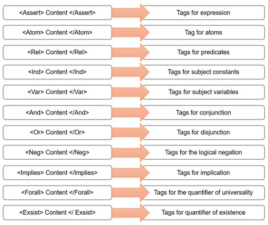 Among the rule-based languages, RuleML (developed and maintained by the non-profit organization RuleML Inc., Fredericton, Canada) may be considered an actual standard. It is a system of rule modeling language families used for unified representation and exchange of basic types of rules between different logics and platforms [51,52,53,54,55].