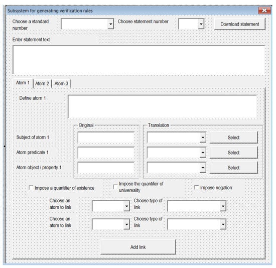 The RuleML application was supported with both text editors and available development tools, which can partially automate this process. However, there was a specific environment in Excel using Visual Basic for Applications developed with a user-friendly interface. The interface of the developed software module is shown in Figure 6. This tool was developed in Excel using Visual Basic for Applications.