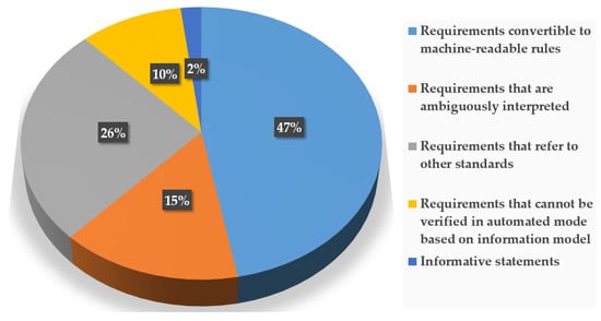 The provisions of the standard were passed through an algorithm to form appropriate machine-readable rules based on them. As a result, 356 statements were received, which were divided into five groups (Figure 7).
