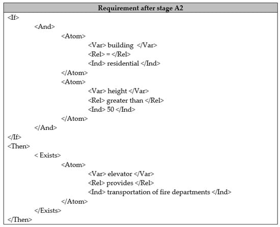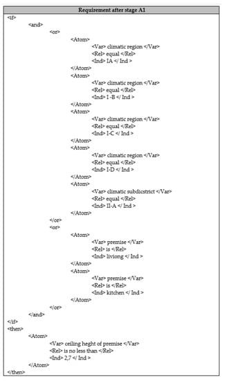 This provision corresponds to one statement. Figure 8 and Figure 9 show how this requirement was transformed after applying the algorithm. It is worth noting that to ensure the compactness of the presentation, the upper-level tags <Assert>-</Assert> and <Implies>-</Implies> were omitted. The resulting rule is ready for use for the automated verification of the building’s information model.