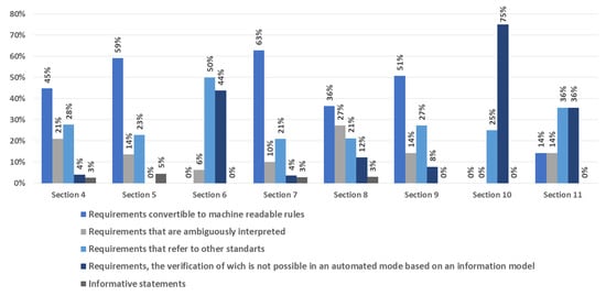 - In four of the eight sections, the amount of requirements suitable for translation into machine-readable format is close to 50% or higher, with a maximum of 63% in the “Fire safety” section. Analysis showed that attempts to verify fire safety requirements based on information models were the most frequent compared to others.