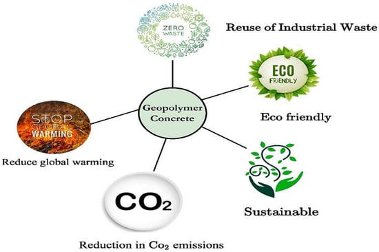 GP is an inorganic material usually produced from aluminosilicates or ceramics that creates non-crystalline or amorphous, long-range, covalently bonded networks with its temperature-dependent microstructure when mixed with an alkaline activator solution. It can be considered as a green cement that has superb mechanical characteristics, low energy in its production, and releases less carbon dioxide for the life cycle global warming intensity of concrete []. Furthermore, applications of GP may be used for coatings and adhesives, high-temp ceramics, medicinal applications, geotechnical for the purpose of soil stabilization, the construction of asphalt pavement, and new types of cement for concrete [,,]. GP usage has more advantages than the ordinary PC since it can protect the environment and provide materials that can save energy used for construction works, which include wastes as a sustainable resource that allows the reuse and recycling of agricultural and industrial waste and its by-products, for instance as biomass ash, FA, cement kiln, and mine tailings []. GP contains superb characteristics, such as corrosion and fire resistance to chemical (sulfate and salt) accidents, and low thermal conductivity features with improved ability to restrain dangerous toxic wastes that are not environmentally sustainable. Additionally, currently, demolition and construction residues have created raw materials for GPs owing to the availability and high contents of silica and oxide []. However, the consumption of PCs will cause environmental pollution because of CO2 emissions. Hence, alternative materials have been utilized to substitute PC in the concrete. PC, which is usually used as the pozzolanic binder in many civil construction works, emits greenhouse gases []. Concrete is a composite material that combines aggregates and binders to form a versatile building material that is used in many structural construction projects and has a global consumption of around 30 billion tons per year. Hence, there is a reduction in the amount of PC that is used as a fundamental binder to create conventional concrete []. Furthermore, the production of PC is related to harmful environmental issues such as carbon dioxide emissions and the severe usage of natural resources []. A cumulative amount of 1.5 tons of raw materials is needed to mix with approximately 1 ton of PC to generate 0.55 tons of carbon gases, with the burning fuel producing approximately 0.4 tons of CO2 that sum up from 0.85 to 1.1 tons of carbon gas emissions []. Moreover, industrial cement production is related to burning approximately 12 to 15 percent of fossil fuels in the kiln or furnace, de-carbonation of limestone, and using electrical energy. Since the past decade, there has been an increase in awareness related to environmental issues due to the production of PCs [,]. As a result, professionals and researchers in the construction industry have been searching for viable alternative approaches to generating sustainable green materials for construction in order to achieve zero carbon emissions by recycling solid wastes and their by-products by replacing conventional concrete materials []. The principal advantage of using GP-cement is low fuel usage and decreasing the emission of carbon dioxide since chemical procedures produce zero carbon dioxide and can cause an 80% to 90% reduction in carbon dioxide emissions. Other benefits are shown in Figure 1. First of all, the low carbon footprint of geopolymer cement has a lower carbon footprint than traditional Portland cement, making it an environmentally friendly choice for construction projects. Secondly, the durability of geopolymer cement is highly durable and can withstand extreme weather conditions. Third, the cost-effectiveness of geopolymer cement is higher than that of traditional cement, as it requires less energy and materials to produce. Forth is strength. Geopolymer cement is stronger than traditional Portland cement and can withstand higher temperatures and pressures. Moreover, geopolymer cement has a higher fire resistance than traditional cement, making it an ideal choice for construction projects that need to be more fire-resistant. Hence, geopolymer cement requires less maintenance than traditional cement, making it easier and more cost-effective to maintain. Finally, geopolymer cement can be used in a wide range of construction projects, from roads to bridges to buildings [].