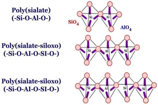 During the geo polymerization process, the following two basic procedures are observed: First, use sodium–hydroxide to dissolve the A–Ss obtained from the pozzolanic ash materials to get small ions of reactive silica and alumina. Next, the polycondensation process forms amorphous to semi-crystalline polymers []. Inorganic materials containing A–S will react chemically with alkaline sols, which leads to the polycondensation process to create GPs that have three basic structures depending on the ratio of alumina to silica []. The three basic structures are namely poly (sialate), poly (sialate–siloxy), and poly (si-alate–disiloxo), as shown in Figure 2.