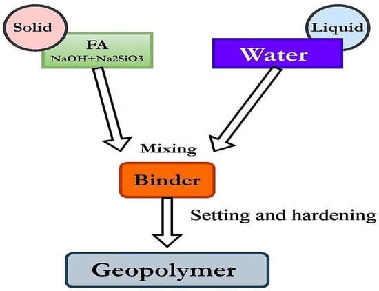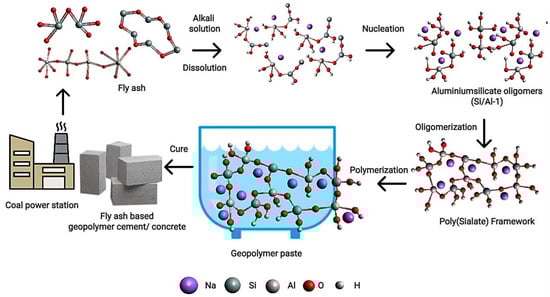 where M denotes the alkali cation, k denotes the polycondensation degree, and q denotes the alumina-to-silica ratio. Under alkaline conditions, a 3-D polymeric chain structure is generated during the chemical process, whereby inorganic synthetic GP is obtained. The microstructural and mechanical characteristics of the developed GP are influenced by the composition of the raw materials and the alkaline solution concentration []. Generally, GPs are produced by mixing source pozzolanic materials and alkaline sols. These A–S materials are mixed with a suitable molarity concentration of metallic hydroxide alkalis solution to produce sodium silicates and GPs []. Figure 3 displays what takes place throughout the FA polymerization process.