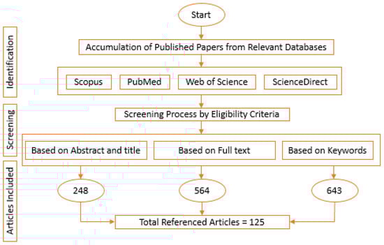 This literature review aimed to examine the ability of various industrial agro-waste and their derivatives (ash) in the production of AA binder concrete to create eco-friendly and cost-effective construction materials []. The use of agro-industrial waste-based geopolymer composites has gained significant attention due to their potential to reduce waste and create sustainable materials. However, the literature on this topic is scattered, making it difficult to obtain a comprehensive understanding of the current state of research. This systematic review aims to synthesize the existing research on agro-industrial waste-based geopolymer composites using the Preferred Reporting Items for Systematic Reviews and Meta-Analyses (PRISMA) guidelines [,]. A systematic search was carried out in four electronic databases (Scopus, Web of Science, ScienceDirect, and PubMed) to identify relevant studies published from 1995 to 2022, as shown in Figure 5. The search was performed using a combination of keywords related to agro-industrial waste-based geopolymer composites. Studies that met the inclusion criteria were evaluated for their quality using the Bias tool [,]. The initial search yielded 1455 studies, of which 135 were considered eligible for inclusion in this review. The studies were published between 2001 and 2022, and the majority of them were experimental and review studies. The studies investigated the effects of various parameters, such as the composition of the waste, the alkaline activator used, and curing conditions, on the microstructural durability and mechanical behavior of the composites. The schematic diagram of this methodological process is shown in Figure 6. In line with the foregoing, related and relevant literature studies on industrial agro-waste ashes, for instance, FA, sugarcane bagasse ash (SBA), palm oil fuel ash (POA), rice-husk ash (RH–SiO2), sawdust (SA), and GGBFS, were discovered in this search and screening process [,]. Suitable keywords or subjects, for instance, A–Ss and geo polymerization, alkalis, AA binder, material science, potassium–hydroxide (KOH), sodium–carbonates (Na2CO3), sodium silicates (SS) and sodium–hydroxide (NaOH) were utilized to search in the research databases [,].