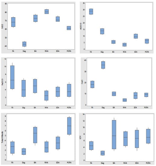 FA was noted to contain a maximum content of Al2O3 of approximately 26–32%, but GGBFS only contained 12–16%. Meanwhile, agro-waste ashes contained the least alumina, ranging from 3% to 10%. When the source materials were combined with the metallic alkaline solution, the product obtained was sodium A–S hydrate gel. However, when combined with lime (CaO), the product obtained was calcium A–S hydrate gel []. However, GGBFS was observed to contain maximum lime content of approximately 35 to 39%, while FA produced approximately 15 to 23% lime, and the agro-waste ashes produced minimum lime content with RH–SiO2 of approximately 2 to 5%. Furthermore, FA was noted to contain a maximum amount of ferrite (Fe2O3) of approximately 4–10%, but agro-waste ashes and GGBFS contain similar quantities [,]. However, FA and GGBFS produced the minimum content of total alkalis at approximately 1% to 4%, while the agro-waste ashes contain higher total alkalis, with POA producing the maximum at approximately 6% to 9%. This is attributed to the higher content of potassium oxide in the agro-waste ashes, whereas ions, for instance, metallic sodium, can help to balance the negative charges in the form of SiO4 and AlO4 []. Furthermore, the agro-waste ashes were noted to yield a higher LOI, and SBA has a maximum content of approximately 4% when compared to IW ashes, which have a minimum GGBFS of 1.5–2.5%. LOI revealed that the waste ashes contain unburnt carbon that can cause unpleasant performance in the AA binder (AAB) concrete. A large amount of unburnt biomass particles can trigger a larger LOI, which in turn causes uncontrolled burning [].
