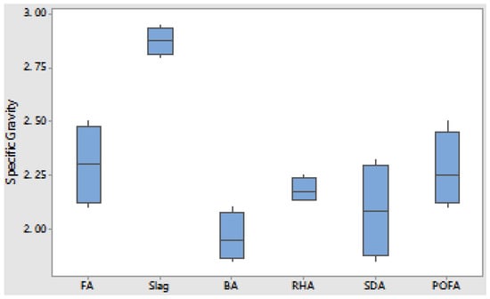 Specific gravity is an important factor that influenced the mixing, proportioning, and workability of the ingredients used in the concrete and also affected the performance of the waste ash-based AA binder. Mixing source materials with a minimum specific gravity adds a greater amount of powder to AAB at higher levels of replacement. GGBFS produced the highest specific gravity outcome at approximately 2.8 to 2.95, followed by FA at 2.2 to 2.5, whereas the agro-waste ashes generated minimum results of at least 1.9 to 2.1 with SBA, as illustrated in Figure 8. It can be observed from the graph that the reduction in the values of the LOI is possible because of the removal of fibrous biomass elements, which caused an increase in the source material waste ash samples’ specific gravity response. This is improved by focusing on the incineration or processing methods to obtain an adequate level of relative density and suitable fineness [,,].