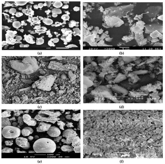 Residual ashes’ SEM micrographs. (a) FA [], (b) GGBFS [], (c) SBA [], (d) RH–SiO2, (e) POA [] and (f) SA [].