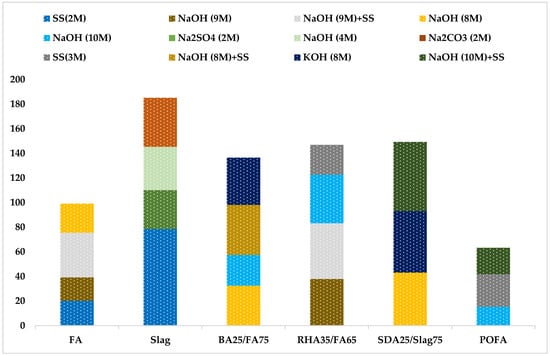 Alkaline-activated material is a huge classification of materials that combines different kinds of binder products obtained from chemical reactions involving alkaline metal sources, whether in the solid or solution state and A–S powder. The alkaline sources, namely carbonate, sulfates, alkali–hydroxides, Al2O3, SiO2, and cations, are able to increase the pH and act as a catalyst or speed up the solid solution of the source material. Alkali silicates and hydroxides are generally used as AAs, in which the characteristics of the activators play a vital role in the activation process [,].