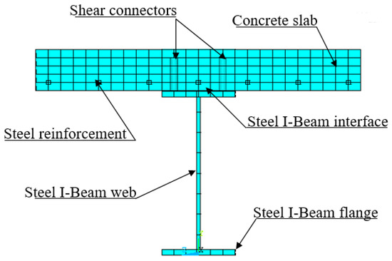 Understanding the geometrical shape and material characteristics of each component is essential to selecting the right elements for modeling the various composite beam parts. Additionally, the connectivity between each element and its neighbors had to be taken into account. There is an element library for ANSYS [20] that satisfies each of these demands. The concrete slab, steel I-beam, steel reinforcement, shear connectors, and the junction of the concrete slab and the steel I-beam were all modeled using seven different elements. The FE mesh for the composite cross-section is shown in Figure 1. The capability, real constants, and material properties of each element are described below to illustrate the modeling of each component.