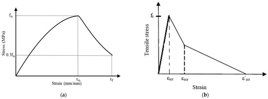 For the stress–strain curve of concrete under tension, a two-phase constitutive model, precracking and post-cracking (see Figure 3b), proposed by Gopinath et al. [22] is used in this analysis. Concrete is modeled as homogenous and isotropic material in the uncracked state, and linear behavior is assumed for concrete until reaching the tensile strength. This behavior is illustrated in Equations (3) and (4).