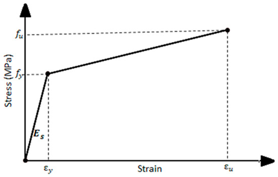 LINK8 is a 3D spar element used to model the reinforcing bars, the stirrups embedded in the concrete slab, and the post-tensioned tendons. This element has three degrees of freedom at each node: translations in the nodal x, y, and z directions. It is a uniaxial tension–compression element. There are capabilities for plasticity, creep, swelling, stress stiffening, and large deflection. Two nodes, cross-sectional area, initial strain, and material characteristics all contribute to the element’s definition. For steel reinforcement, the element’s initial strain is set to zero. However, an initial strain equivalent to the initial post-tensioning force was defined to simulate the external post-tensioning [15,16]. The material mechanical properties, such as modulus of elasticity, yielding stress and strain, ultimate stress and strain, and steel density, are considered. For all structural steel materials, the stress–strain curve is represented by a bilinear relationship, as shown in Figure 4. A slip may occur at the steel reinforcement–concrete interface. The relationship between slips and bond stresses is very complex. Therefore, the link element is connected to the concrete nodal points, applying a full bond between them. It is predicted that this bond will not affect the results in a noticeable way since the slab behaves as a whole unit.