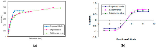 We undertook a theoretical–experimental comparison with the results of previously analyzed composite beams by Fabbrocino et al. [25]. The load–deflection curve is plotted in Figure 9a, where the proposed model is compared with the experimental and Fabbrocino’s numerical results. The shapes of the numerical and experimental curves show reasonable agreement. The experimental collapse occurs at a load of 490 kN and a deflection equal to 157 mm. The failure load of the proposed FE model is 450 kN, about 91.80% of the experimental load; and a deflection of 56.7 mm, about 36.11% of the experimental deflection. Although the calculated failure load showed good agreement with the experimental load, the deflection is smaller than the experimental deflection which means that the proposed FE model has an increased stiffness compared to the experimental beam. However, good agreement was noticed between the experimental tests and the suggested model in the stud slippage value calculated along the beam, as shown in Figure 9b. The deformation of the shear connectors and slippage between the concrete slab and steel beam are shown in Figure 10. The mode of failure in the FE model is due to crushing in the concrete flange followed by yield in the steel beam, which is similar to the experimental and Fabrocino’s numerical results (see Figure 11).