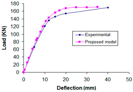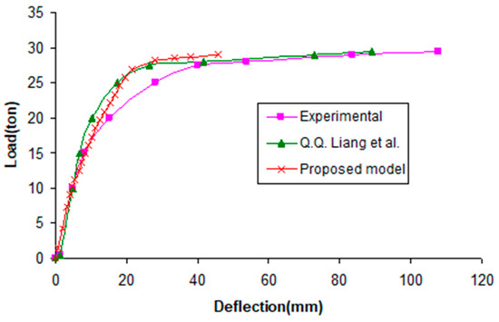 Comparisons in terms of the load–deflection curves are presented in Figure 13, where the proposed model is compared with the experimental results and numerical data proposed by Liang et al. [18]. The shapes of the numerical and experimental curves show good agreement. The experimental collapse load is 29.5 tons and the corresponding deflection is 107.8 mm. The failure load of the proposed FE model is 27.9 tons, about 94.50% of the experimental load, and the corresponding deflection is 41.6 mm, about 39% of the experimental deflection. The stress distribution in the steel beam as well as the cracking and crushing of the concrete slab are shown in Figure 14.