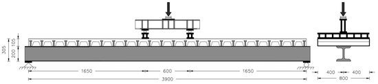 A simply supported composite beam with profiled steel sheeting, tested by Nie et al. [4], was used to validate the proposed FE model. The length of the tested beam, SB-1, was 3900 mm and was loaded symmetrically at two points within the span using a spreader beam to obtain a pure bending moment zone. The specimen setup and dimensions are shown in Figure 15. The material properties as well as the value of the coefficients characterizing the constitutive relationships used in the numerical simulation of the beam are listed in Table 3. A comparison of the experimental and FE results through the relation between loads versus deflection is shown in Figure 16.
