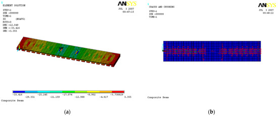 The FE mode of failure for the analyzed beam tested by Ansourian [26]. (a) Stress distribution in the steel beam. (b) Concrete crushing and cracking.