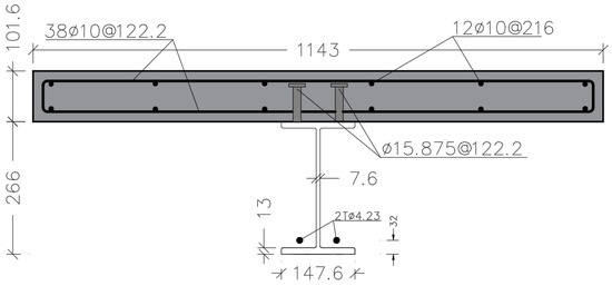 The proposed FE model was calibrated against corresponding experimental data from a two-span continuous composite beam tested by Ansourian [26]. The span of the tested beam was 4500 mm and the loads were applied at the mid-span of the beam. By taking advantage of the symmetry of the two spans, only one span was modeled, which reduced the size of the model and in turn reduced the computational time. The beam was characterized by the cross-section shown in Figure 12, and the material properties are listed in Table 2.