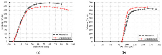 Comparisons between the FE and experimental results. (a) Moment–deflection relationships. (b) Moment–PT force relationships.