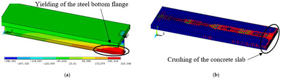 The FE mode of failure for the analyzed beam P14. (a) Yielding in the steel beam. (b) Concrete crushing and cracking.